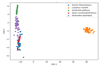 MANOVA analysis revealed clear morphological differences among species, especially Lutjanus russellii, although partial overlaps were observed between Gerres filamentosus and Selar crumenophthalmus.