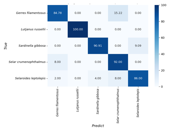 The confusion matrix illustrates the classification performance of the LDA model in distinguishing five fish species based on BDP–ShI otolith descriptors (Fig. 4). The overall classification accuracy is high, with Lutjanus russellii achieving perfect discrimination (100%), indicating its otolith shape is well separated from all other species in the dataset. Selar crumenophthalmus and Sardinella gibbosa were also classified with high accuracy, reaching 92.00% and 90.91%, respectively. Gerres filamentosus was identified with 84.78% accuracy, with most misclassifications attributed to Selar crumenophthalmus (15.22%). Selaroides leptolepis showed the lowest classification accuracy among the five species (86.00%), with misclassification distributed across Sardinella gibbosa (4%) and Selar crumenophthalmus (8%). These results suggest that while the BDP–ShI descriptors provide reliable species-level discrimination, there remains some overlap in otolith morphology among closely related or morphologically similar species.