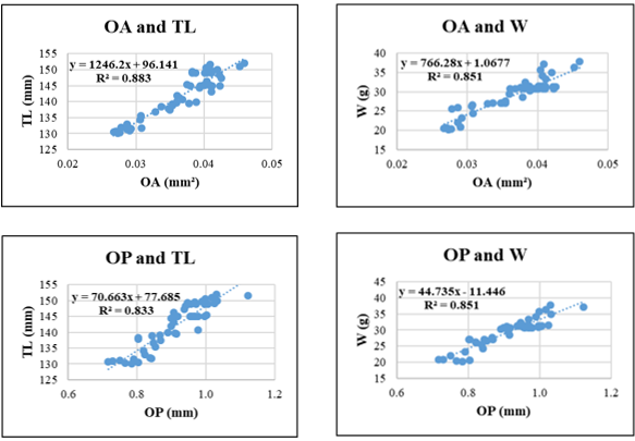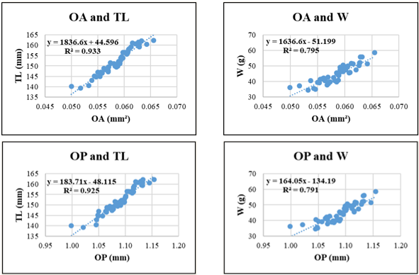 Selar crumenophthalmus displayed high R² values for relationships involving OA–TL (0.933) and OP–TL (0.925), indicating strong predictive potential of otolith surface and perimeter features for body length. Conversely, W-related regressions such as OA-W (R² = 0.795) and OP-W (R² = 0.791) were less predictive, possibly due to individual variation in weight relative to otolith structure.