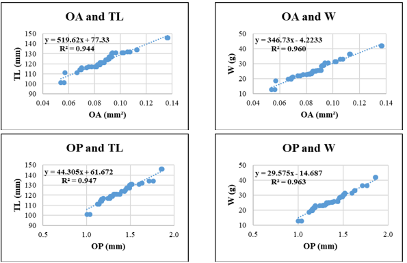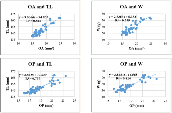 The following morphometric relationships were analyzed: OL - TL; OH - TL; OL - W and OH - W; OP - TL; OA - TL; OP - W and OA - W. All morphometric relationships were modeled using simple linear regression, selected based on the best fit to the data distribution. The general form of the linear regression model used is: y = a + bx, where x is the independent variable and y is the dependent variable derived from empirical data. Coefficients a and b were determined from actual measurements and used to estimate theoretical values of y for given values of x. The significance of the regression was tested using analysis of variance (ANOVA).