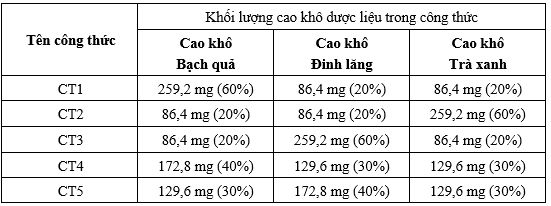 Dựa theo tính chất của mỗi loại dược liệu (đinh lăng, trà xanh, bạch quả), liều dùng trong một số nghiên cứu đã công bố [3-7], nhóm nghiên cứu bào chế viên nang cứng với khối lượng cao dược liệu 450 mg/viên; liều dự kiến có tác dụng trên người là 04 viên/ngày, từ đó quy đổi sang liều trên chuột nhắt là 432 mg/kg/ngày. Xây dựng 05 công thức bào chế để sàng lọc (Bảng 1) và lựa chọn công thức phù hợp nhất.