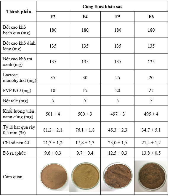 Để khảo sát sự ảnh hưởng của tá dược độn đến chất lượng viên nang, nghiên cứu cố định khối lượng bột cao khô bạch quả, đinh lăng, trà xanh, PVP K30 và bột talc. Tiến hành khảo sát các công thức F1, F2 và F3. Kết quả được trình bày ở Bảng 2.