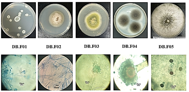 Five fungal strains were isolated from rubber materials and were named from DB.F01 to DB.F05. The isolated strains had significantly different colony morphology in terms of color and size. All strains developed mycelium and produced spores. The morphological characteristics of colonies on PDA medium, spore stalks, and spores of the isolated fungal strains under an optical microscope at 1000x magnification were shown in Figure 2.