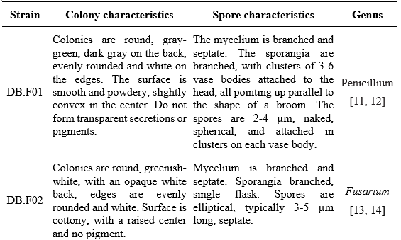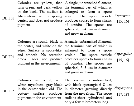 From the results of observing both the characteristics of the colonies and the sporophytes of the isolated strains, it is possible to classify the fungal strains into the genus. Based on the published results of the study on the biological morphology of molds, five mold strains were identified as belonging to 4 different genera: Penicillium, Aspergillus, Fusarium, and Nigrospora. The morphological characteristics of the 5 fungal strains were described in Table 1.