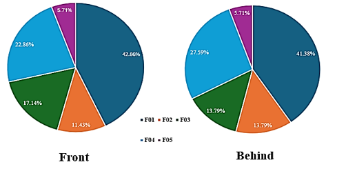 Among the five fungal strains isolated from the rubber sheet, DB.F01 exhibited the highest density on the front surface at 42.86%. The density of fungal strains on the front surface ranged from 5.71% to 42.86%. In contrast, DB.F05 appeared least frequently on the isolation plates, a trend also observed for strains isolated from the back surface of the rubber sheet, where densities ranged from 5.71% to 41.38% (Figure 3). In comparison with previous studies on the surface coverage density of filamentous fungi on composite materials, fungal strains belonging to the genus Penicillium exhibited the highest coverage, with values of 40.44% (P. corylophilum ELM.C2) and approximately 42% (Penicillium sp. DB.F01), respectively. The coverage density of Penicillium species was also the highest on both the front and back surfaces of rubber materials, as well as on all four sides of radar components made from composite materials [19].