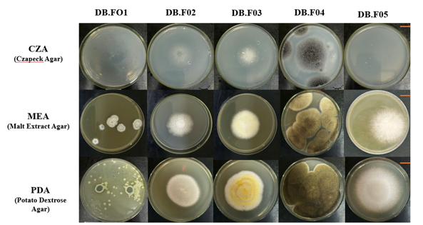 The fungal strains were cultured on three types of media: CZA, MEA, and PDA, supplemented with 100 mg/L ampicillin at a temperature of 30ºC for 3-5 days. Growth potential was determined based on the colony diameter of each fungal strain [6].
