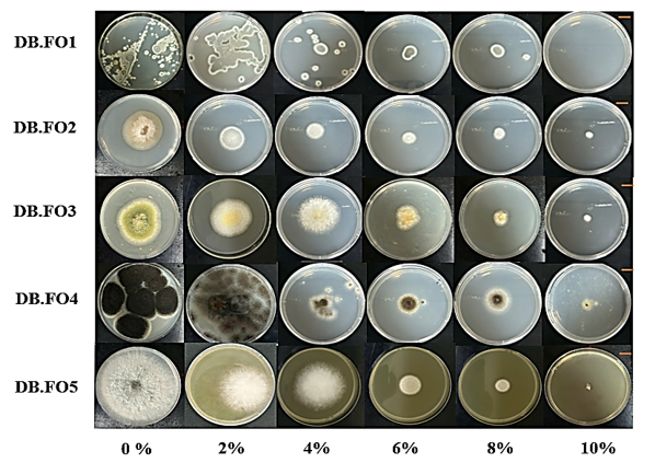 The fungal strains were cultured on PDA medium supplemented with antibiotics (100 mg/L ampicillin; 100 mg/L tetracycline) at a temperature of 30°C for 7 days across various salt concentrations (0, 2, 4, 6, 8, 10%). Similarly, growth potential was determined based on the colony diameter of each fungal strain [2].
