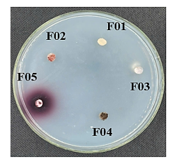 Five fungal strains were evaluated for their ability to produce extracellular enzymes by measuring the diameter of the guaiacol degradation ring, which indicates laccase production. As shown in Figure 6, only one strain, DB.F05, exhibited laccase activity, with an enzyme ring diameter of approximately 6 ± 0.5 mm.