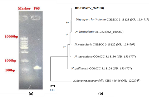 Based on the results of ITS region sequencing, the nucleotide sequence of the filamentous fungal strain DB.F05 has 100% similarity to the filamentous fungal strain Nigrospora lacticolonia CGMCC 3.18123 (NR_153471). Combining the characteristics of colony morphology, spore stalk and the results of self-amplification of the ITS gene region, DB.F05 was identified as Nigrospora lacticolonia DB.F05. This sequence was submitted to GenBank under accession number PV942108.