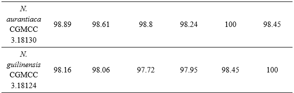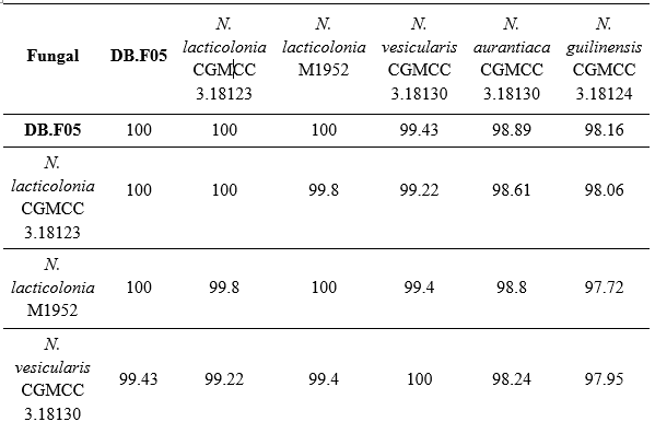 Table 3. Matrix showing the similarity of strain Nigrospora lacticolonia DB.F05 with reference strains in the NCBI database
