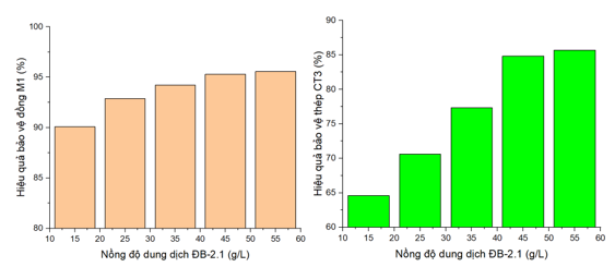 Kết quả Bảng 1 và Bảng 2 cho thấy, khi nồng độ chất ức chế ăn mòn trong dung dịch ĐB-2.1 tăng từ 15 g/L đến 55 g/L, mật độ dòng ăn mòn của đồng M1 giảm từ 10,09 lần (15 g/L) đến 22,50 lần (55 g/L); của thép CT3 giảm từ 2,82 lần (15 g/L) đến 6,99 lần (55 g/L) so với mẫu không có chất ức chế, cũng đồng nghĩa hiệu quả bảo vệ chống ăn mòn đồng M1 và thép CT3 tăng dần. Mức độ giảm mật độ dòng ăn mòn của đồng M1 (22,50 lần) cao hơn so với của thép CT3 (6,99 lần) cho thấy dung dịch ức chế ăn mòn ĐB-2.1 có hiệu quả bảo vệ kim loại đồng M1 tốt hơn so với bảo vệ thép CT3.
