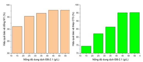 Nồng độ tối ưu củadung dịch ức chế ăn mòn ĐB-2.1 để bảo vệ cho cả kim loại màu (đồng M1) và kim loại đen (thép CT3) là 45 g/L.