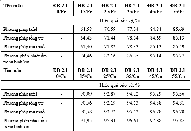 Kết quả Bảng 6 cho thấy trong điều kiện nhiệt ẩm dung dịch ĐB-2.1 có khả năng bảo vệ thép CT3 với hiệu quả bảo vệ từ 74,46% đến 95,27%; đồng M1 từ 91,95% đến 97,88% khi nồng độ dung dịch tăng từ 15 g/L đến 55 g/L. Ở điều kiện ăn mòn khắc nghiệt hơn (có mặt ion clorua) hiệu quả bảo vệ kim loại CT3 thay đổi từ 61,40% đến 85,69%; đồng M1 từ 90,09% đến 96,70%. Khi nồng độ dung dịch ĐB-2.1 ≥ 45 g/L hiệu quả bảo vệ kim loại đen và kim loại màu là tối ưu, với hiệu quả bảo vệ 84-85% đối với thép CT3 và 94-95% đối với đồng M1. Như vậy, hàm lượng tối ưu đối với dung dịch ĐB-2.1 là 45 g/L.